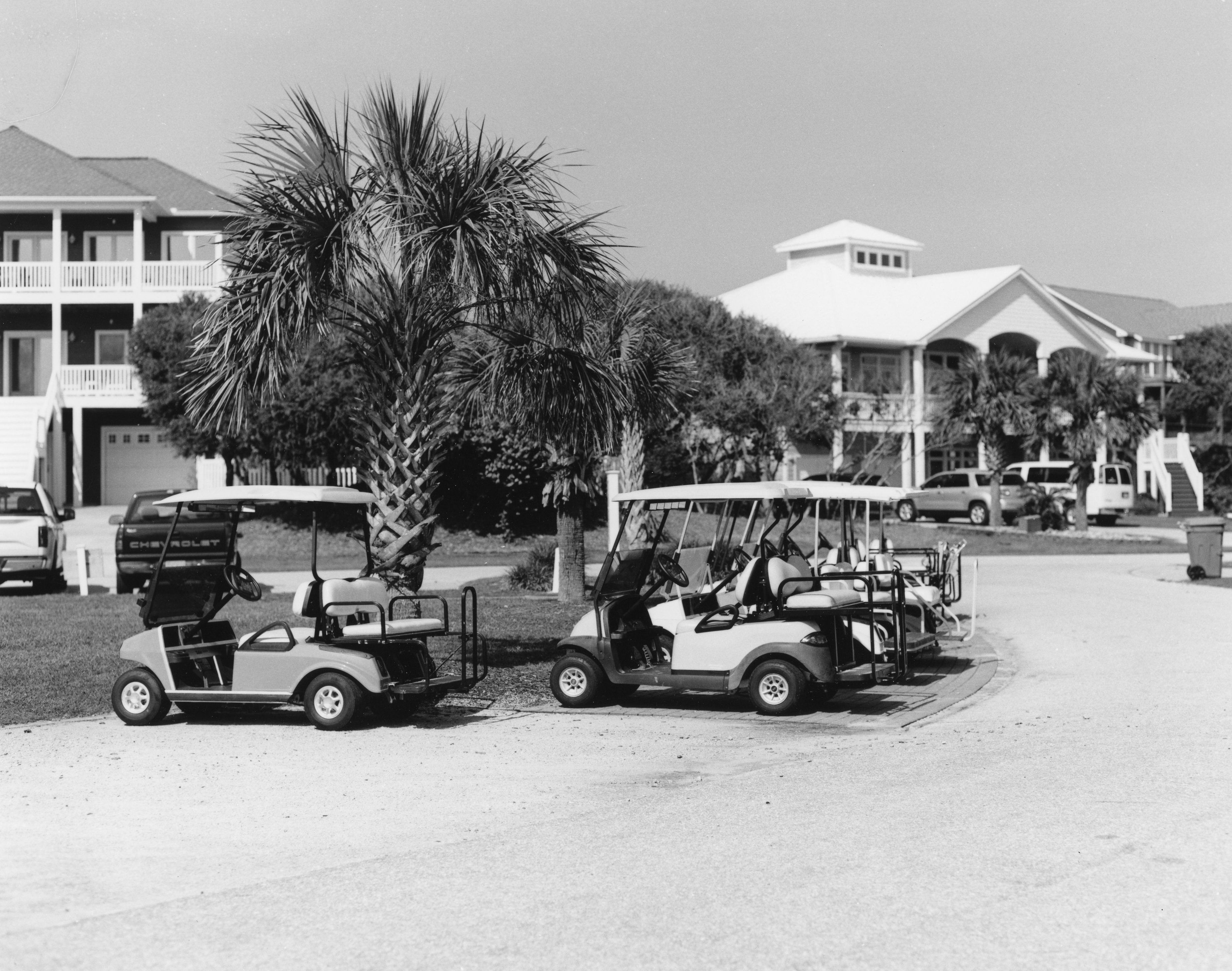 15509 scanResort communities need golf carts, of course. Emerald Isle, North Carolina. The photo was taken in September of 2019 with a Pentax 67 medium format SLR equipped with a 105 mm f/.4 SMC Pentax 67 lens on Ilford FP4+ film. The negative was enlarged optically with a Beseler 23CIIXL enlarger and a 100 mm f/5.6 Schneider Componon-S lens on Ilford Multigrade FB Classic Double Weight Fiber Base silver gelatin photo paper. Processing was done archivally using Kodak chemistry, with a final toning with Kodak Rapid Selenium Toner, treated with hypo clearing agent, and washed in an archival washer.