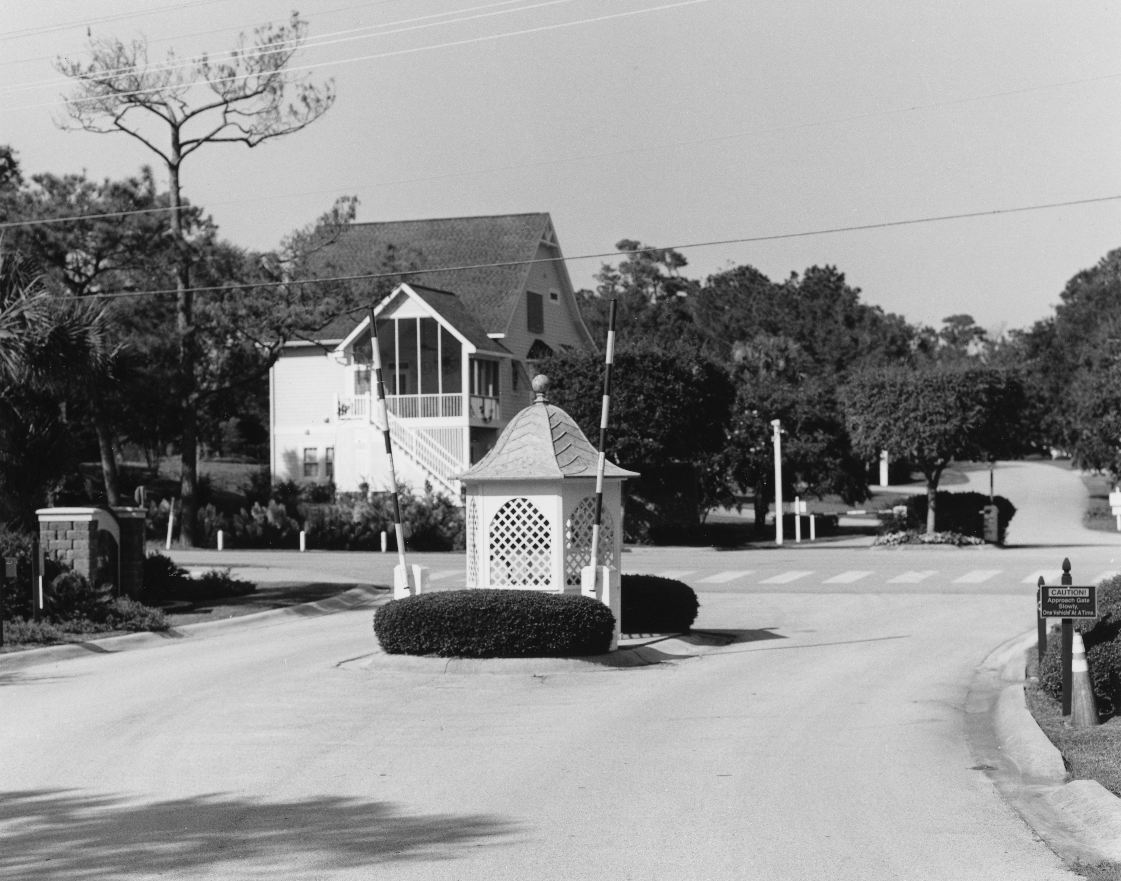 15609 scanEntrance to Spinnaker's Reach, a fairly typical vacation home/rental subdivision. Emerald Isle, North Carolina. The photo was taken in September of 2019 with a Pentax 67 medium format SLR equipped with a 105 mm f/.4 SMC Pentax 67 lens on Ilford FP4+ film. The negative was enlarged optically with a Beseler 23CIIXL enlarger and a 100 mm f/5.6 Schneider Componon-S lens on Ilford Multigrade FB Classic Double Weight Fiber Base silver gelatin photo paper. Processing was done archivally using Kodak chemistry, with a final toning with Kodak Rapid Selenium Toner, treated with hypo clearing agent, and washed in an archival washer.