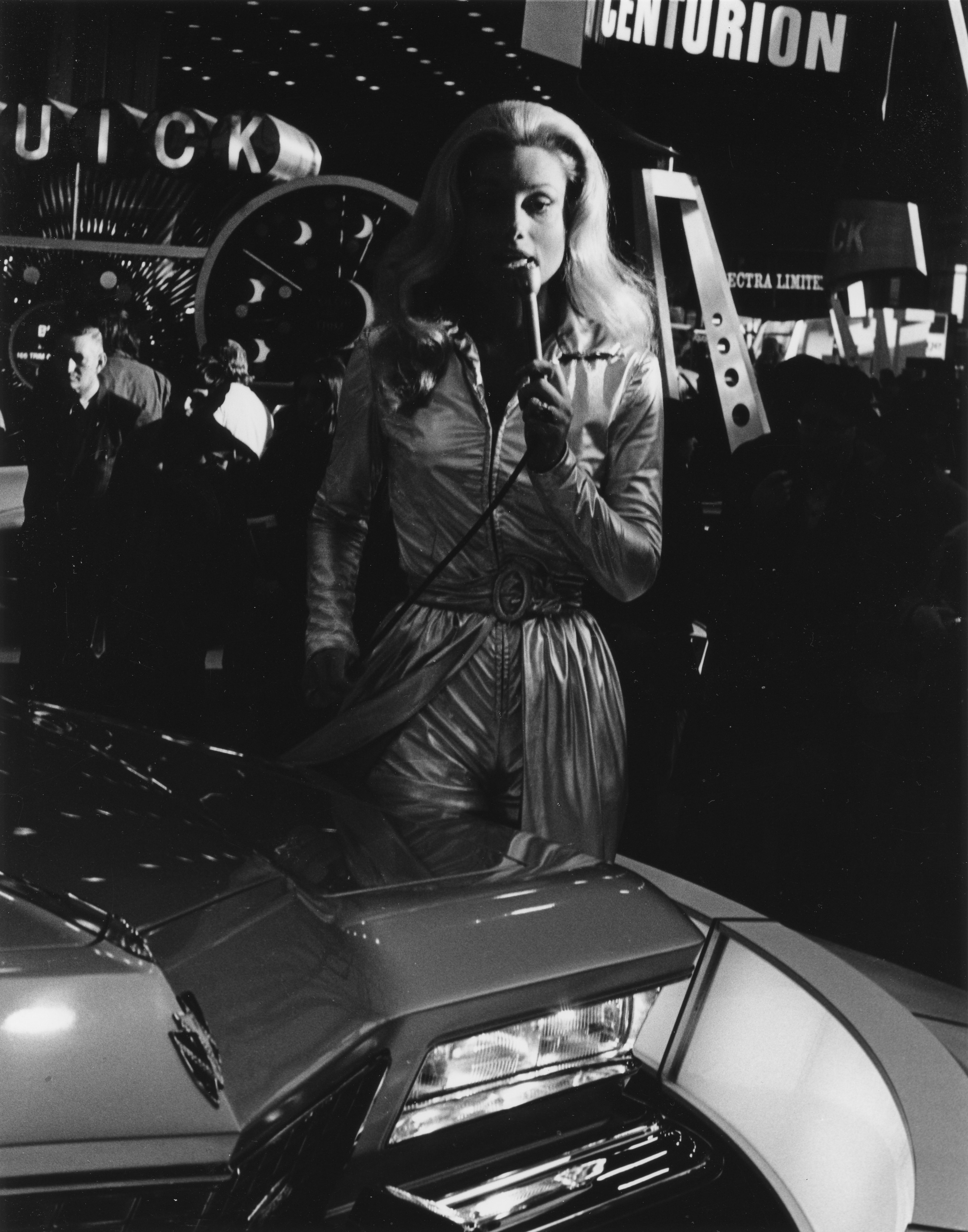 2BAS10 scanModels and models. 1972 Auto Show, Chicago, Illinois, USA. The photo was taken in February of 1972 with a Ricoh Singlex TLS 35 mm SLR equipped with a 55 mm f/1.7 Prinz Auto Rexatar lens on Kodak Tri-X Pan film. The negative was enlarged optically with a Beseler 23CIIXL enlarger and a 50 mm f/2.8 Schneider Componon-S lens on Ilford Multigrade FB Classic Double Weight Fiber Base silver gelatin photo paper. Processing was done archivally using Kodak chemistry, with a final toning with Kodak Rapid Selenium Toner, treated with hypo clearing agent, and washed in an archival washer.